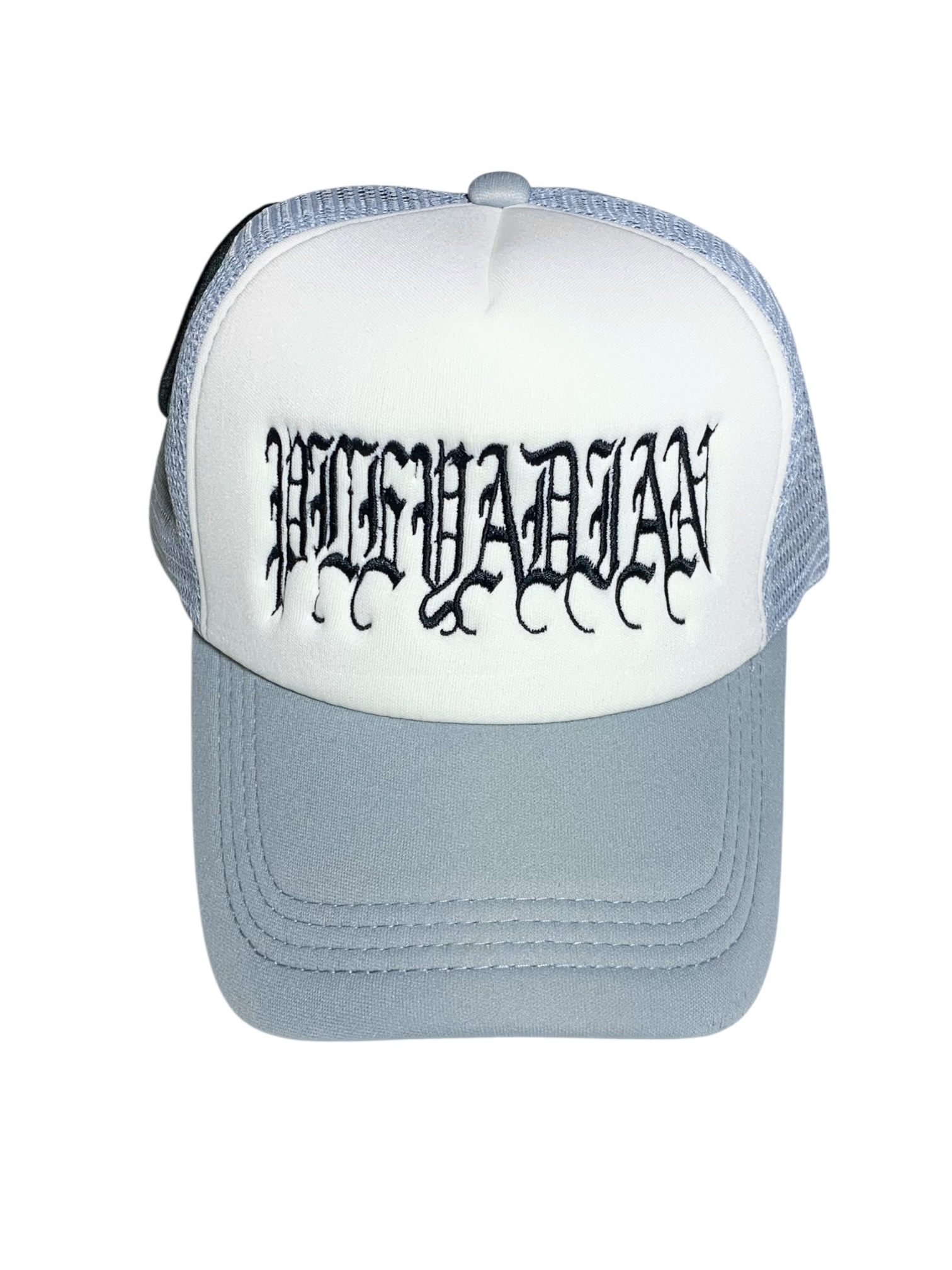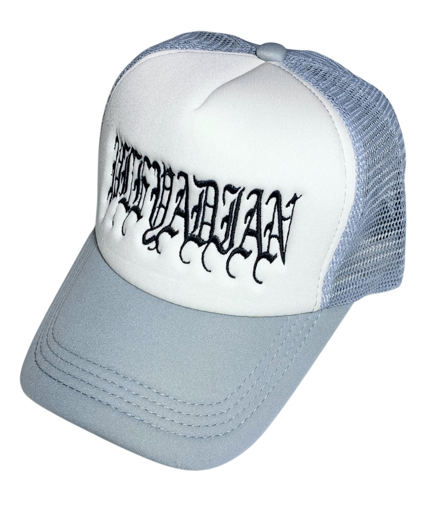 Gorra Trucker gris , frente blanco bordado.
